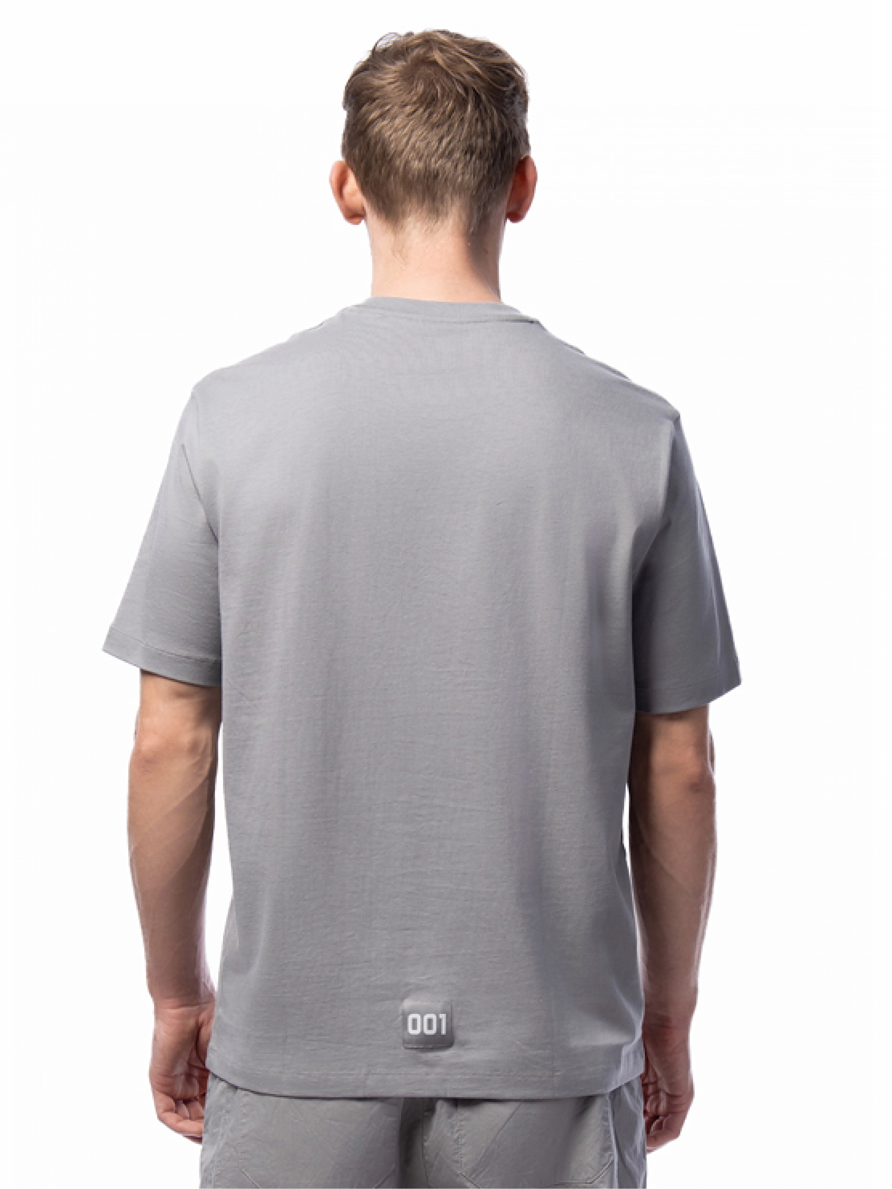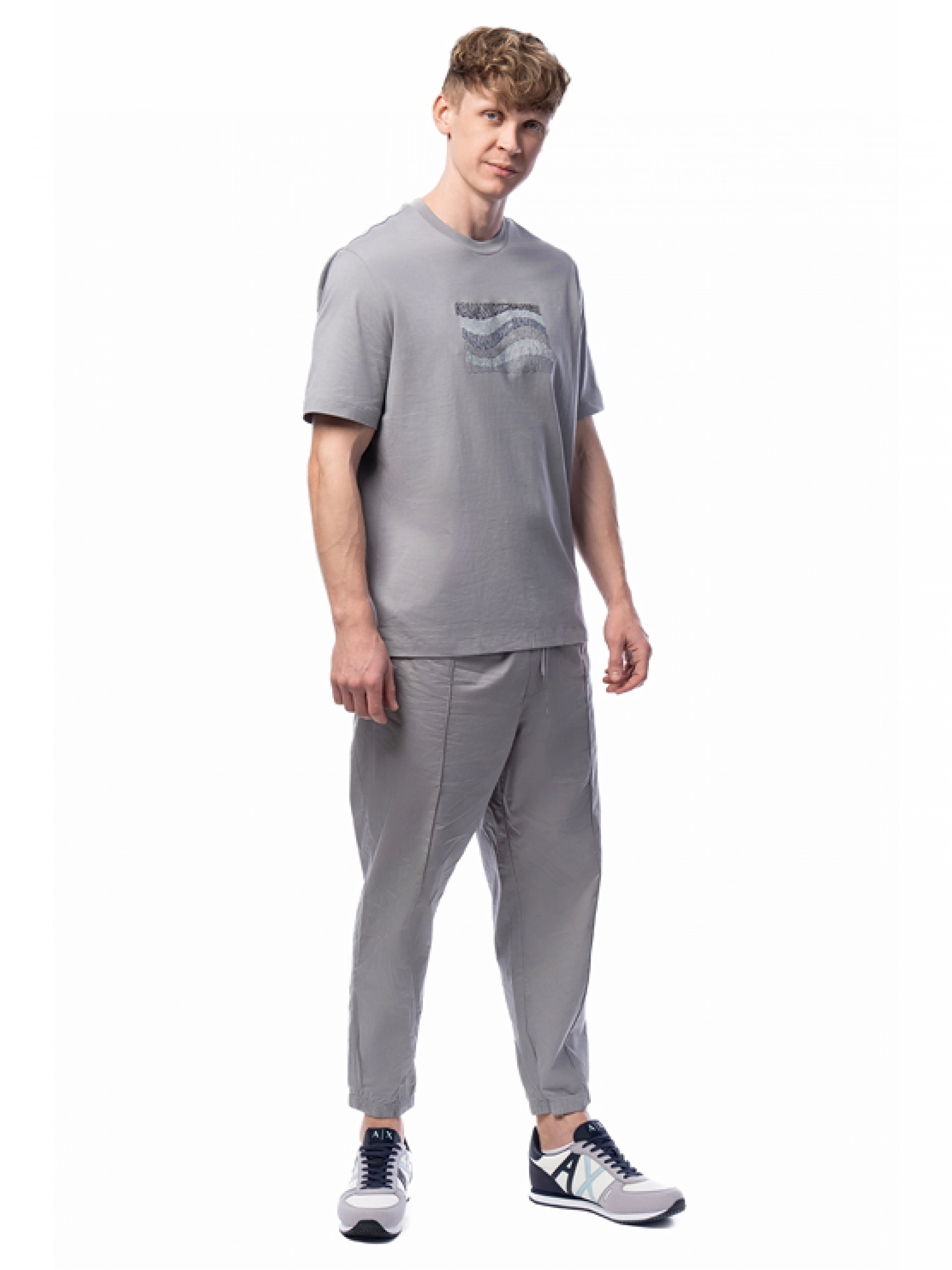 Футболка в сером цвете с принтом в виде волны на груди и названием бренда Armani Exchange