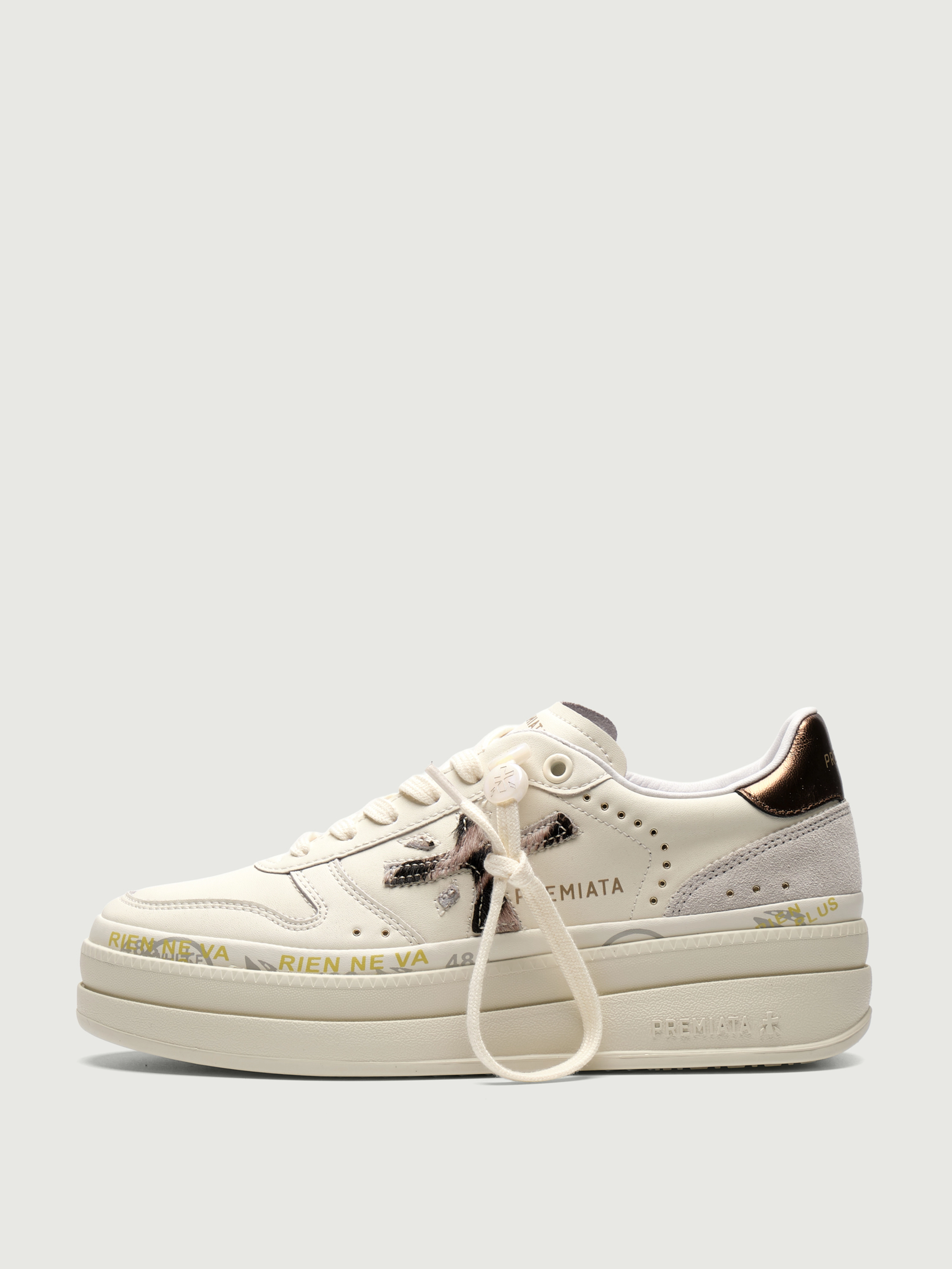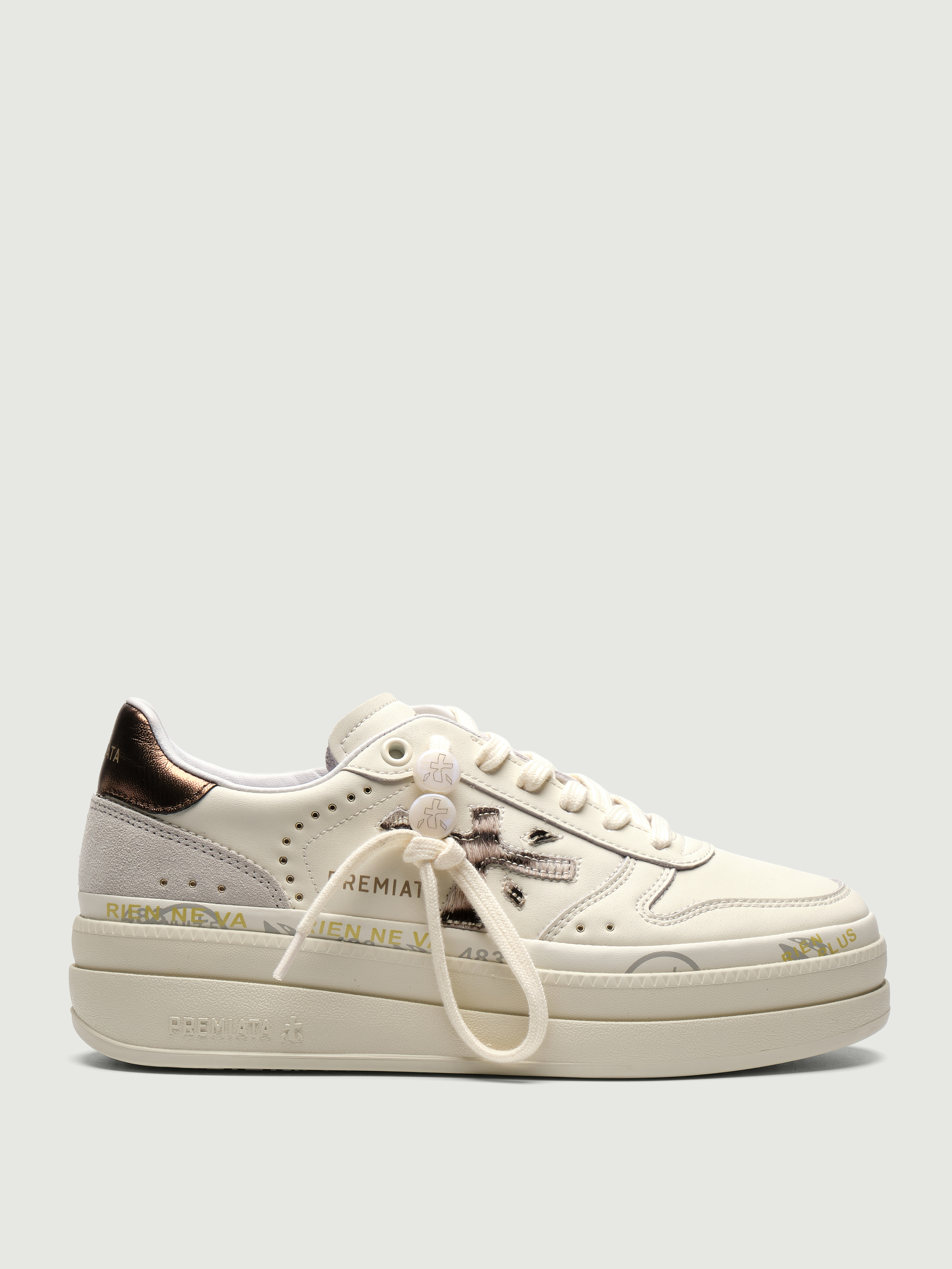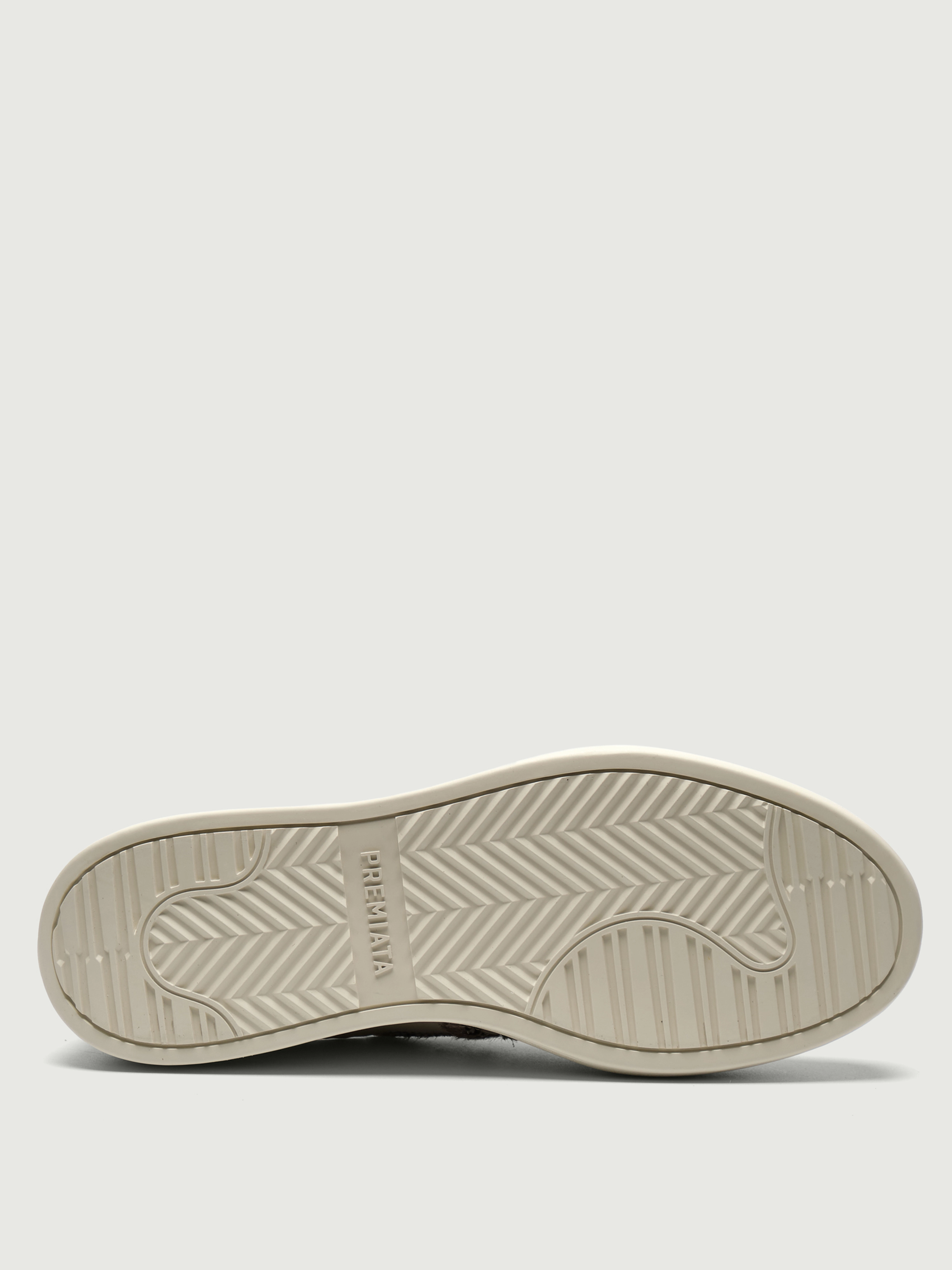 Среди новинок PREMIATA must have. Кремовые кеды Micol с перфорацией по бокам и контрастной вставкой на заднике сшиты из комбинации гладкой матовой кожи и фактурной замши в светло-сером оттенке. Чтобы пара была еще комфортнее, для подклада выбрали более тонкую и нежную кожу. По бокам модель украшена фактурными аппликациями-иероглифами в анималистичном принте из телячьей кожи. Акцентной деталью кед стала вставка на заднике из гладкой кожи в цвете перламутровой бронзы. Стиль достигает новых высот благодаря сочетанию таких дизайнов, как двухслойная подошва на платформе и промежуточная подошва, украшенная знаковыми марками бренда.