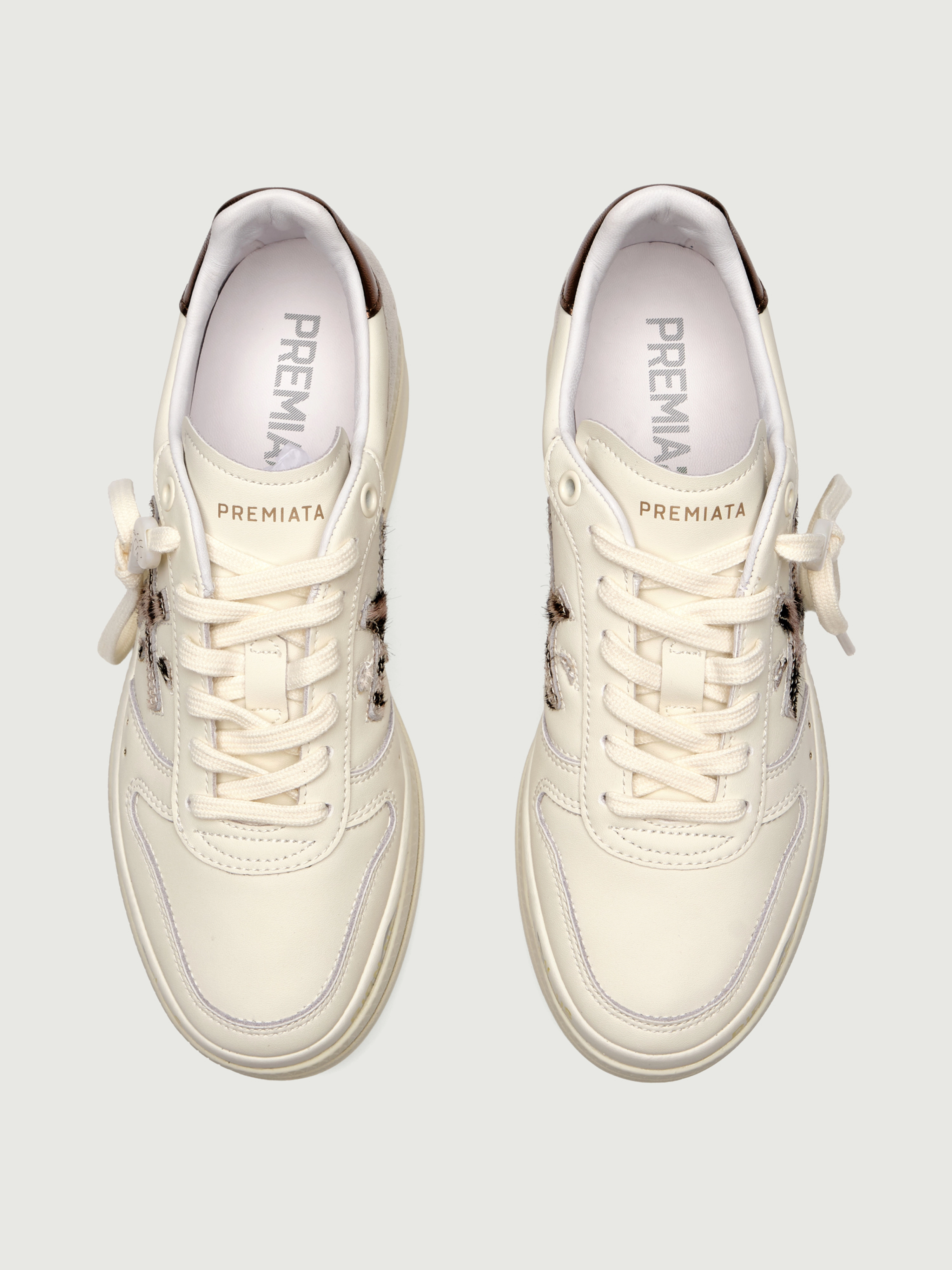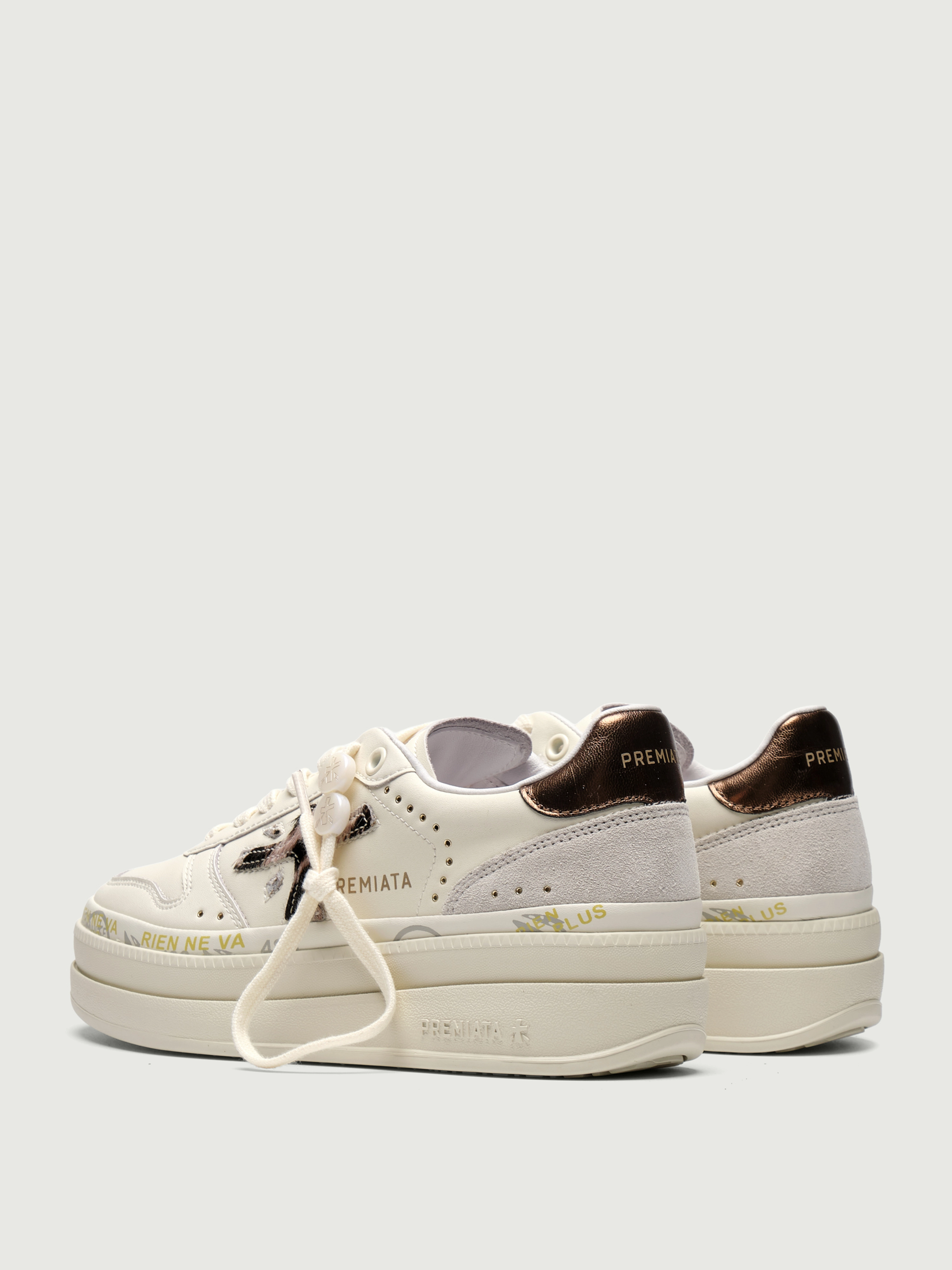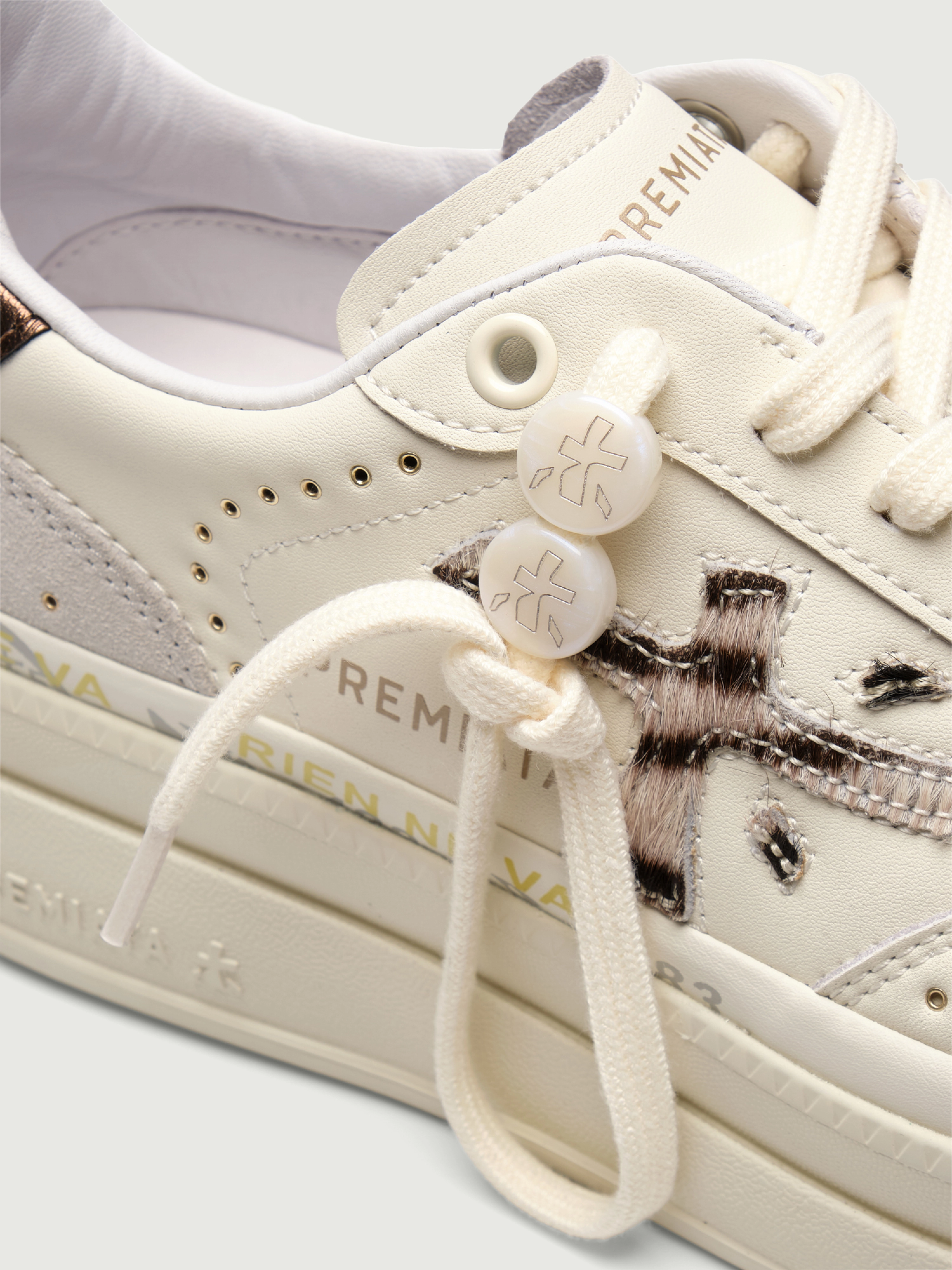 Среди новинок PREMIATA must have. Кремовые кеды Micol с перфорацией по бокам и контрастной вставкой на заднике сшиты из комбинации гладкой матовой кожи и фактурной замши в светло-сером оттенке. Чтобы пара была еще комфортнее, для подклада выбрали более тонкую и нежную кожу. По бокам модель украшена фактурными аппликациями-иероглифами в анималистичном принте из телячьей кожи. Акцентной деталью кед стала вставка на заднике из гладкой кожи в цвете перламутровой бронзы. Стиль достигает новых высот благодаря сочетанию таких дизайнов, как двухслойная подошва на платформе и промежуточная подошва, украшенная знаковыми марками бренда.