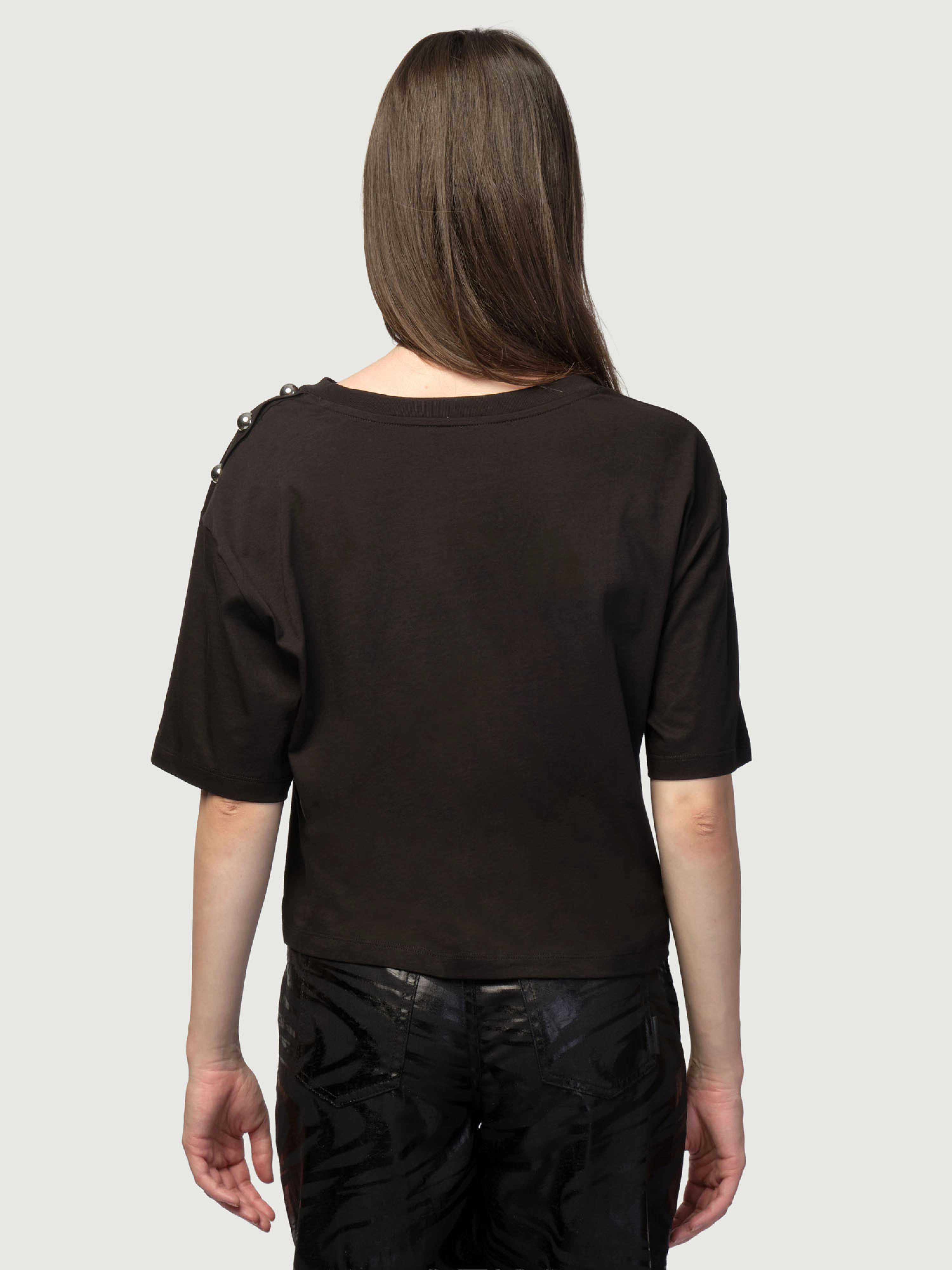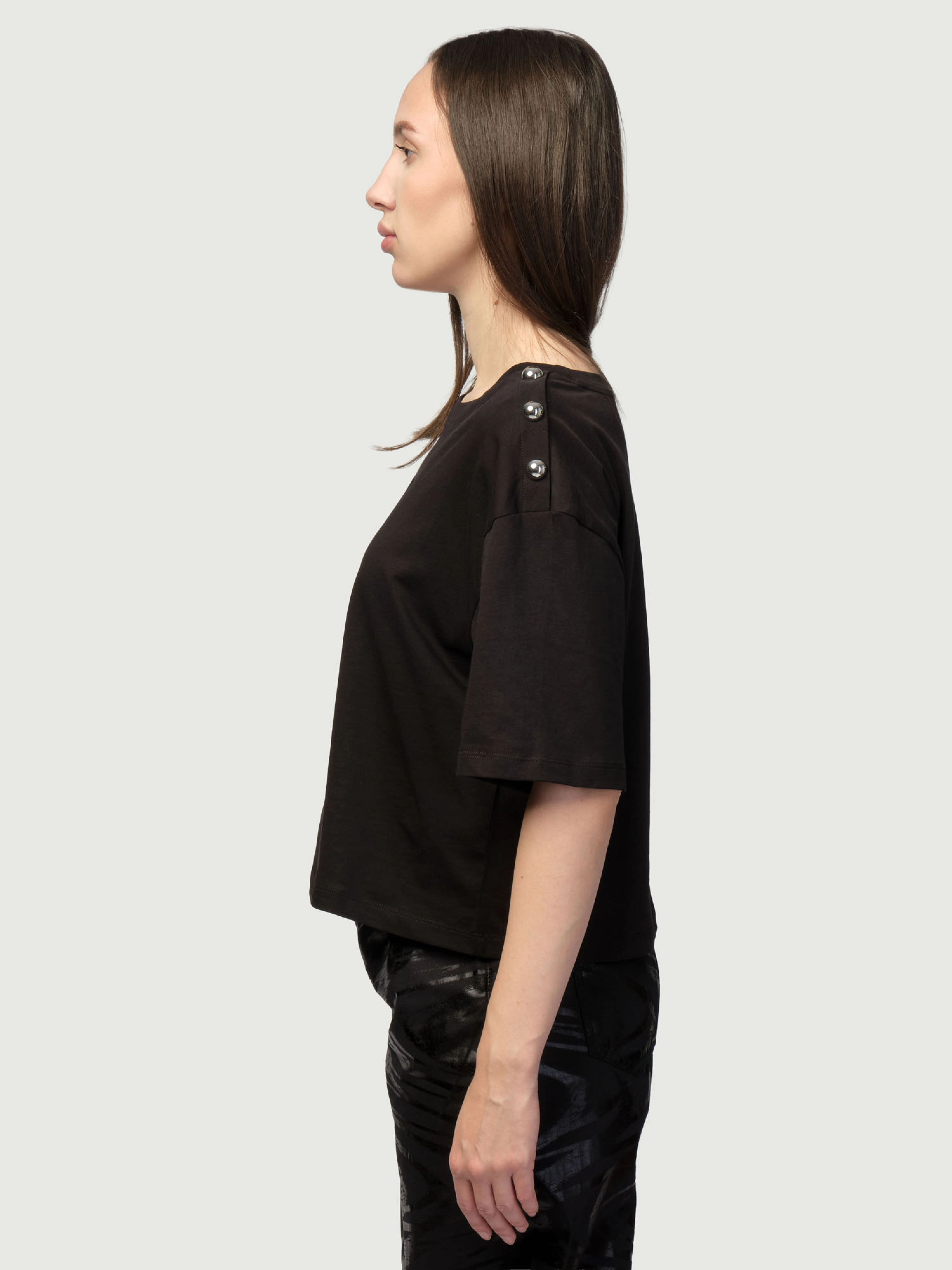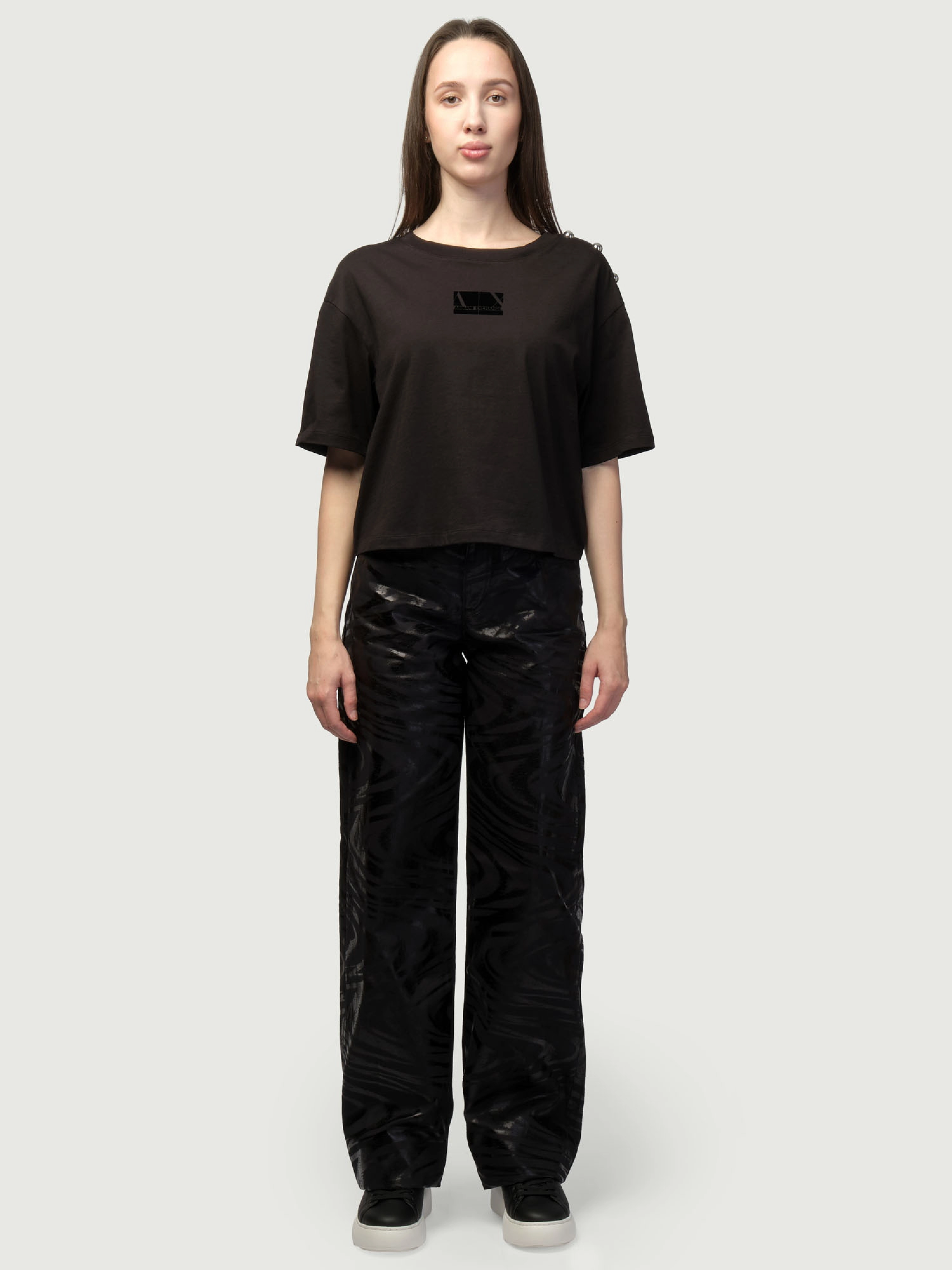 Свободный крой футболки не сковывает движений, позволяя чувствовать себя непринужденно в любой ситуации. Короткие рукава и круглый вырез горловины подчеркивают простоту и универсальность модели. Логотип бренда, расположенный на груди, добавляет образу узнаваемость и современный акцент.