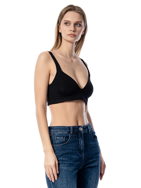 Итальянский бренд PATRIZIA PEPE как пример женственности, изящества и высокого вкуса в мире моды представляет бюстгальтер черного цвета, выполненный из материала, сочетающего в себе нейлон, хорошо сохраняющий форму и цвет и эластан, добавивший данной модели растяжимость, что не маловажно, учитывая, что этот бюстгальтер выполнен без такой детали как застежка и одевается как топ через голову. Модель имеет регулируемые бретели и основание в виде широкого пояса. Мягкие чашки бюстгальтера миндалевидной формы, образующей глубокое декольте и выполнены с тонким прослоением поролона, что дает модели абсолютную непрозрачность, форму и возможность носить ее как самостоятельный топ без покрытия верхней одеждой, либо стильно комбинировать его в образе с расстегнутой рубашкой или пиджаком. В качестве декоративного элемента служит украшение в виде знака бренда на спине.
