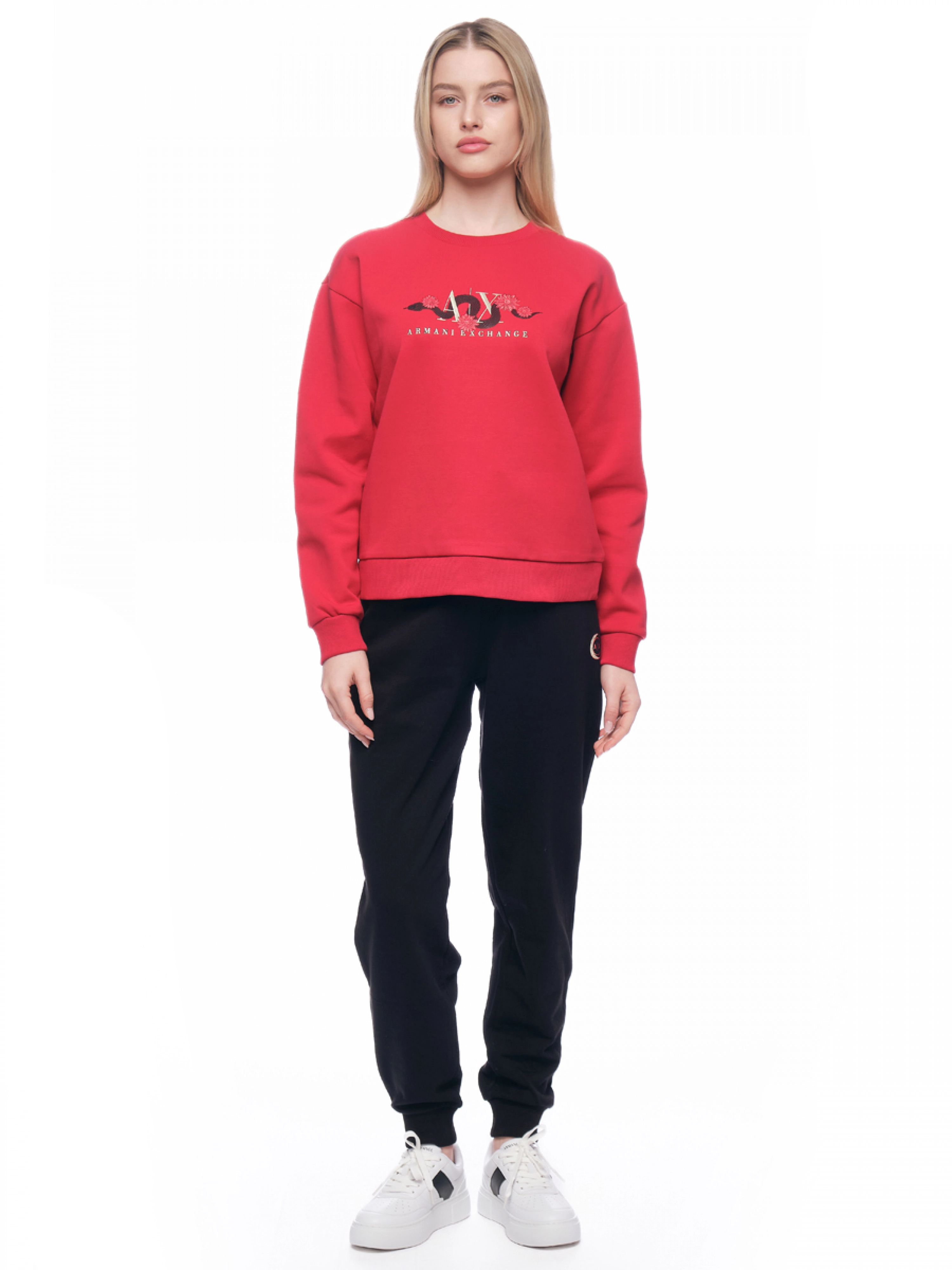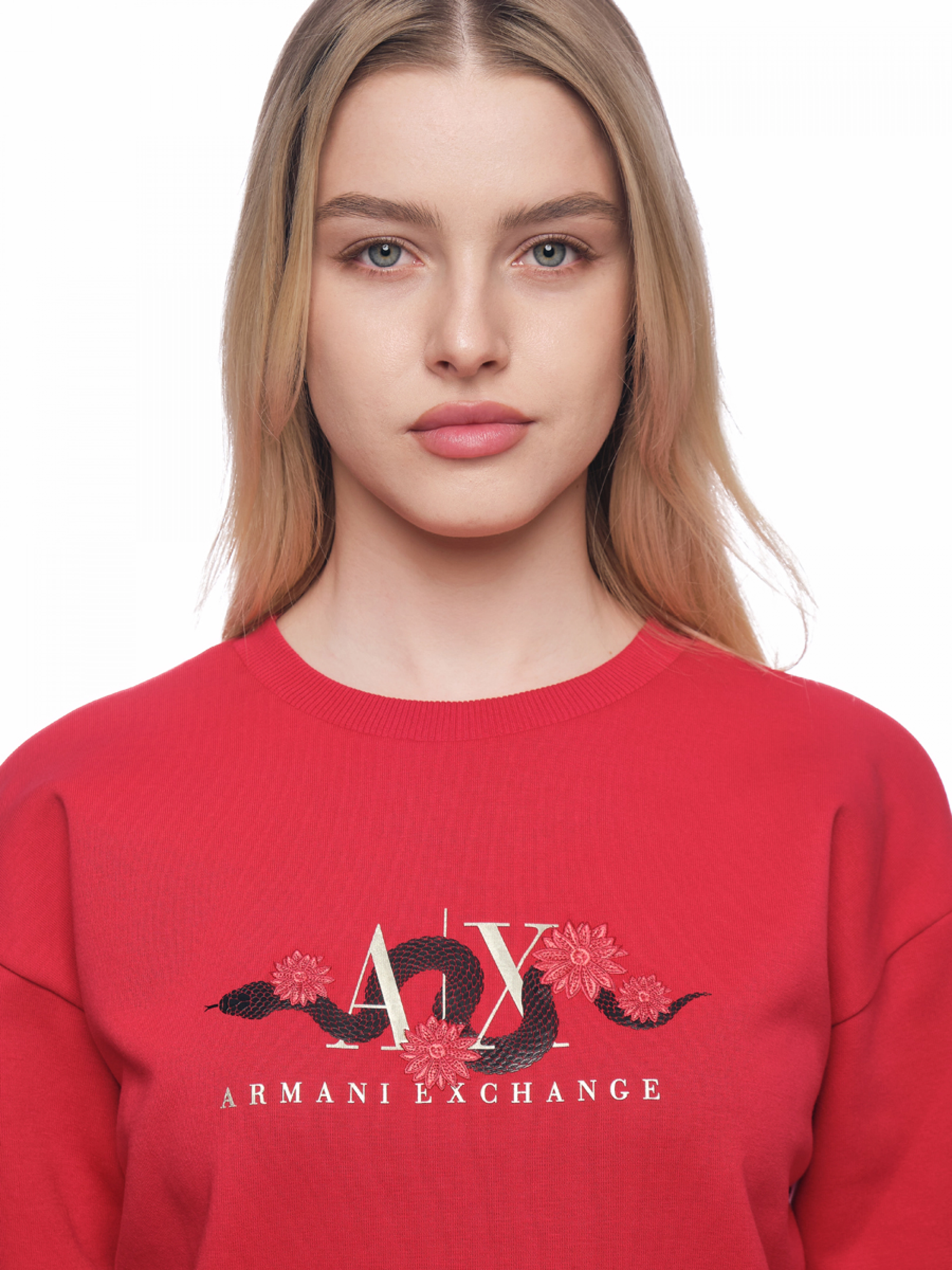 Свитшот в красном цвете с круглым вырезом и логотипом бренда на груди Armani Exchange